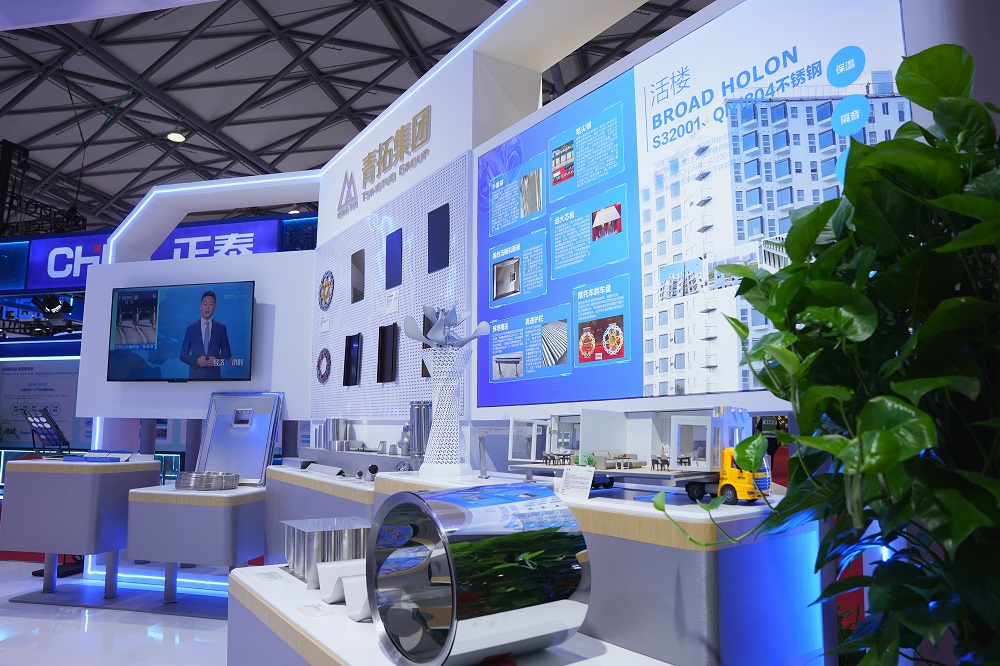 展会现场,青拓集团携甬金科技集团股份有限公司、宏旺控股集团有限公司、奥展实业股份有限公司、广东法迪奥厨卫科技有限公司等产业链上下游企业同台亮相,搭建了一个集展览、技术交流、经贸洽谈活动于一体的综合性产业化平台,全方位展示了其在不锈钢冶炼、加工等领域的最新技术成果与产品亮点,共计展出60余件展品,吸引了众多行业人士关注。